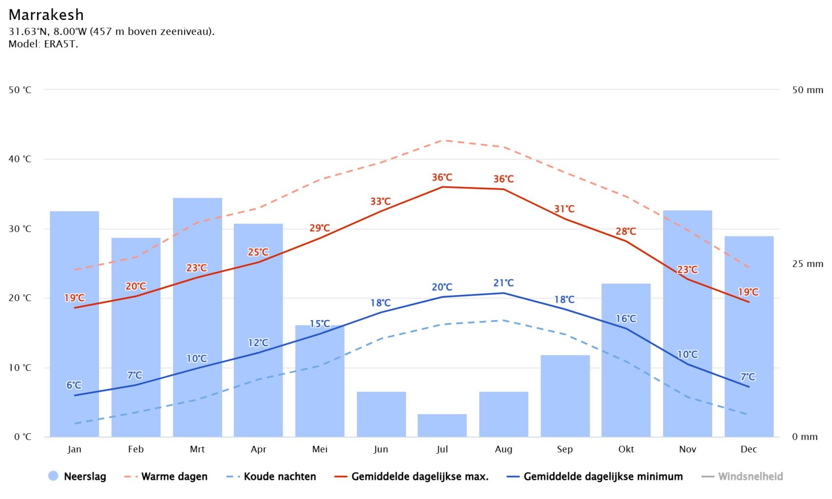Samenvattend ziet het klimaat in Marokko er uit zoals in de grafiek weergegeven.